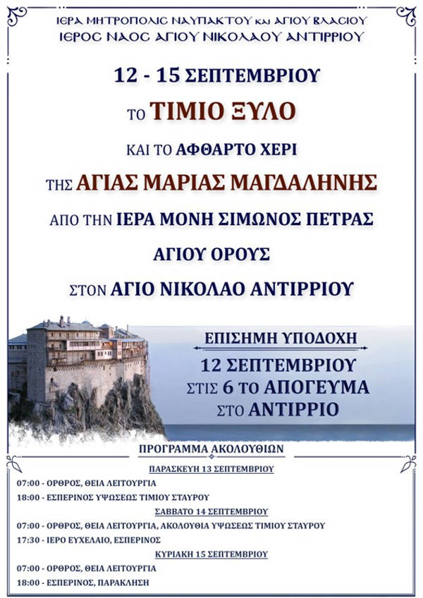 Κατόπιν τῆς εὐλογίας τοῦ Σεβασμιωτάτου Μητροπολίτου Ναυπάκτου καί Ἁγίου Βλασίου κ.κ. Ἱεροθέου, θά μεταφερθοῦν, στόν Ἱερό Ναό Ἁγίου Νικολάου Ἀντιρρίου, τό ἄφθαρτο χέρι τῆς Ἁγίας Μαρίας τῆς Μαγδαληνής καί τό Τίμιο Ξύλο ἀπό τήν Ἱερά Μονή Σίμωνος Πέτρας Ἁγίου Ὄρους.
