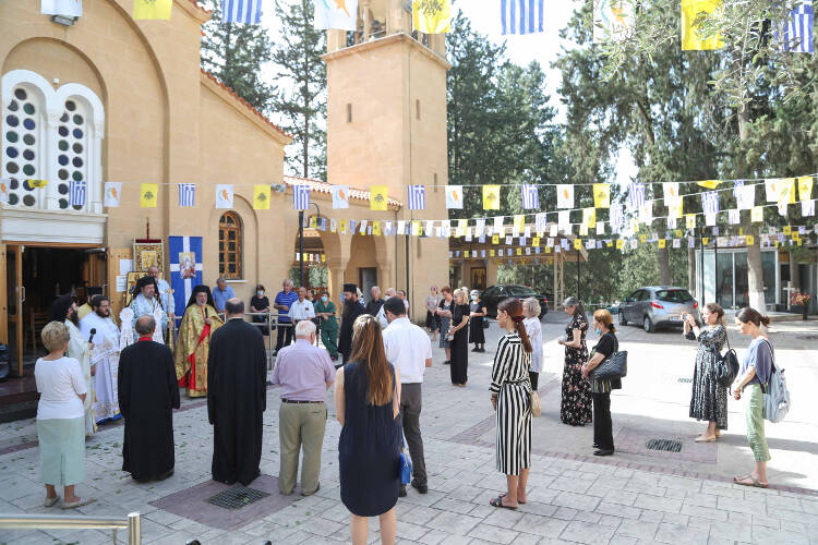 Το πρωί της Πέμπτης 21ης Μαΐου 2020, ταυτόχρονα με την έναρξη εφαρμογής της δεύτερης φάσης χαλάρωσης των περιοριστικών μέτρων στην Κύπρο, τελέστηκε πανηγυρική αρχιερατική Θεία Λειτουργία στον κοιμητηριακό ιερό ναό των αγίων Κωνσταντίνου και Ελένης στο Νέο Κοιμητήριο Λευκωσίας, προεξάρχοντος του Θεοφιλεστάτου Επισκόπου Νιτρίας κ. Νικοδήμου, Εξάρχου τού Πατριαρχείου Αλεξανδρείας στην Κύπρο και συλλειτουργούντων τού Καθηγουμένου τής Ι. Μ. Αποστ. Βαρνάβα Αρχιμ. κ. Ιωάννου Ιωάννου και άλλων κληρικών της αρχιεπισκοπικής περιφέρειας Λευκωσίας.