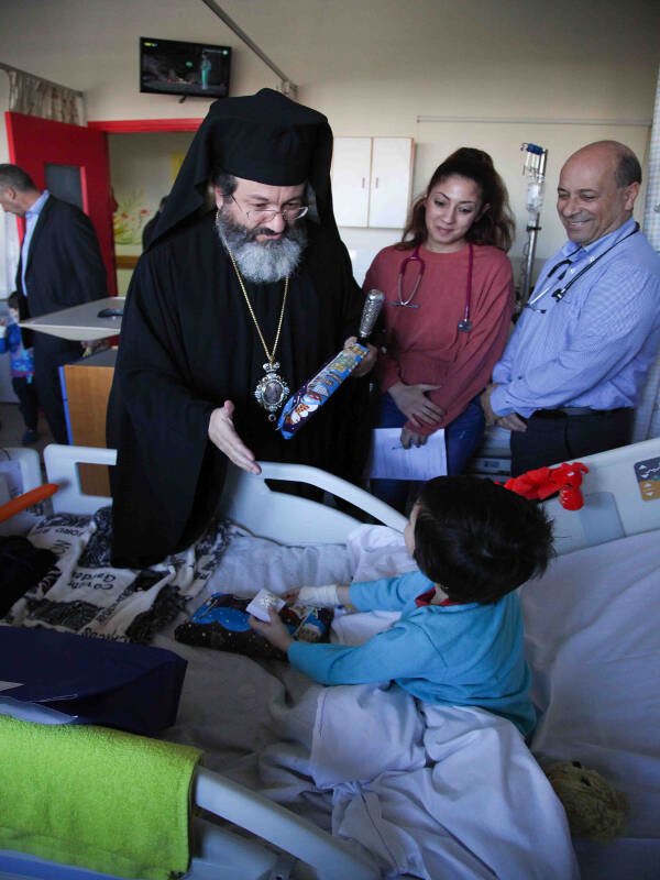 Με την ευκαιρία των εορτών ο Μακαριώτατος Αρχιεπίσκοπος Κύπρου κ.κ. Χρυσόστομος μαζί με τη σύζυγο του Προέδρου της Κυπριακής Δημοκρατίας και πρώτη Κυρία, κ. Άντρη Αναστασιάδη, τον Υπουργό Υγείας κ. Κωνσταντίνο Ιωάννου καθώς και τον Θεοφιλέστατο Επίσκοπο Μεσαορίας κ. Γρηγόριο, επισκέφθηκαν νοσοκομεία της Λευκωσίας για να ευχηθούν στους πάσχοντες συνανθρώπους μας, να εκφράσουν ένα λόγο παρηγοριάς αλλά και να προσφέρουν δώρα προς όλους τους νοσηλευόμενους των νοσοκομείων. Από το πρωί ξεκίνησαν την περιοδεία με το Γενικό Νοσοκομείο Λευκωσίας, ενώ στη συνέχεια επισκέφθηκαν το Μακάρειο Νοσοκομείο και το Ογκολογικό Κέντρο Τράπεζας Κύπρου, φέρνοντας στους ασθενείς το μήνυμα της στοργής και της αγάπης του Κράτους και της Εκκλησίας προς τον κάθε συνάνθρωπο.