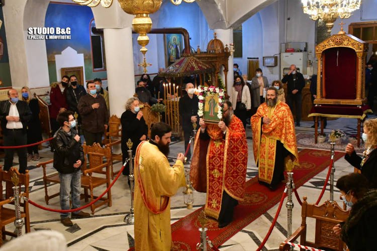 Την παραμονή της εορτής Κυριακή 31 Ιανουαρίου 2021 στον προσκυνηματικό Ιερό ναό του Αγίου Αναστασίου στο Ναύπλιο, τελέσθηκε αρχιερατικός εσπερινός σύμφωνα με τα προβλεπόμενα υγειονομικά μέτρα για τον περιορισμό του κορωνοϊού, χοροστατούντος του Μητροπολίτη Αργολίδας Νεκταρίου.