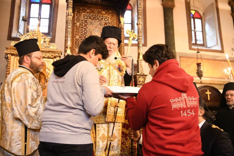 Νωρίτερα, ο Οικουμενικός Πατριάρχης, χοροστάτησε στην Θεία Λειτουργία που τελέστηκε στον Πατριαρχικό Ναό του Αγίου Γεωργίου, συγχοροστατούντων των Μητροπολιτών Γέροντος Δέρκων Αποστόλου, Μυριοφύτου και Περιστάσεως Ειρηναίου, Μύρων Χρυσοστόμου, Καλλιουπόλεως και Μαδύτου Στεφάνου, Κυδωνιών Αθηναγόρα και Σηλυβρίας Μαξίμου.