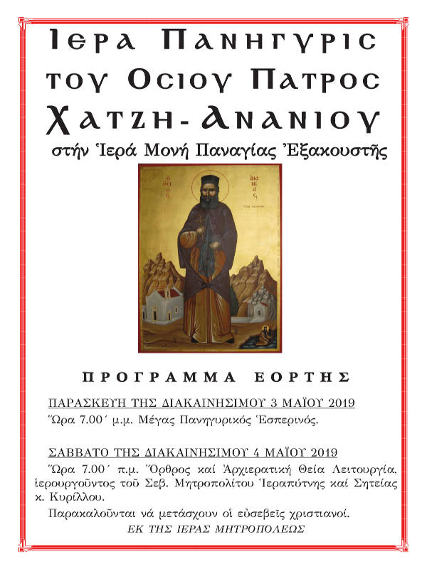Ιερά Πανήγυρις Οσίου Ανανία εκ Μαλλών Κρήτης στην Ιερά Μονή Παναγίας Εξακουστής ης Ιεράς Μητροπόλεως Ιεραπύτνης και Σητείας.
